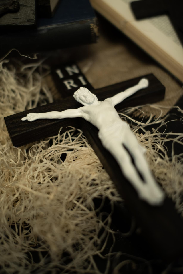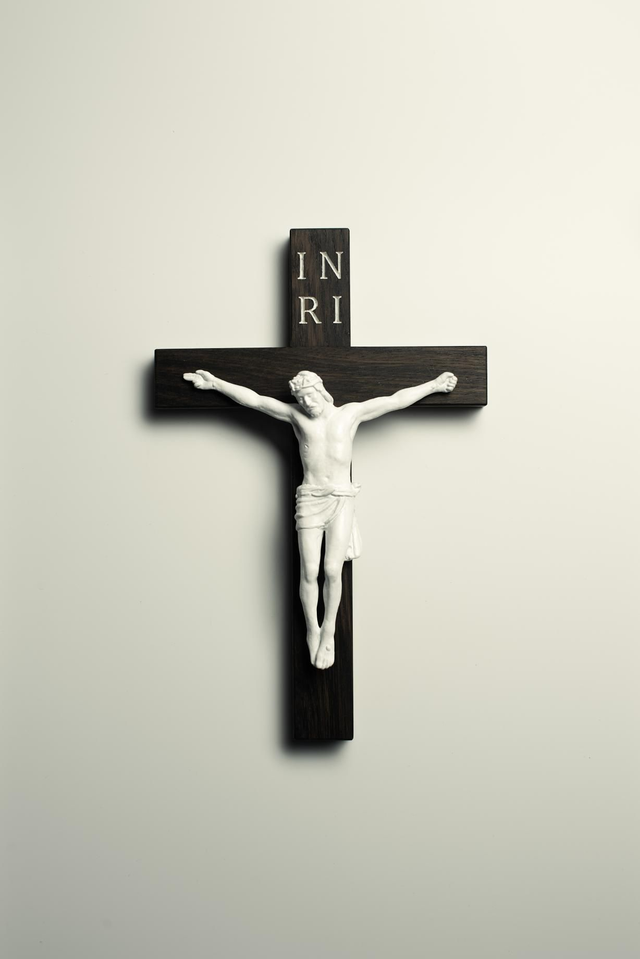 This corpus is 3D printed in white resin using the original bronze corpus modelled on the image on the Shroud of Turin. It is mounted on a bog oak wood carbon dated cross. Engraving INRI painted white. Dimensions 270x180x30x17mm
